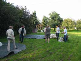 Wo waren wir stehen geblieben? Ach ja. Nachdem Ralf Ziffels uns mit dem Bulli das Material gebracht hat (und unser Gepäck vom Morgen) | haben wir uns also daran gemacht, die Zelte – zwei Wölfe – aufzubauen. Die ebenfalls vorhandene Jurte wurde aufgrund des guten Wetters nicht aufgebaut. | Dann war relaxen und Projekt Bierkühlen angesagt. Nachdem Wolle die Idee hatte, den undichten Badewannenauslauf einfach hochzulegen... |