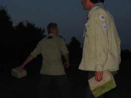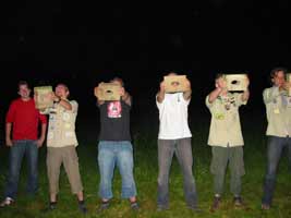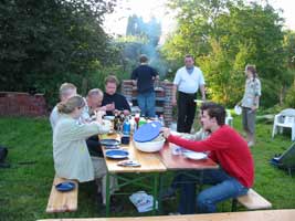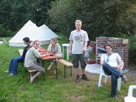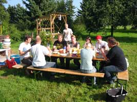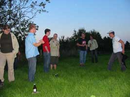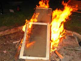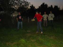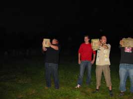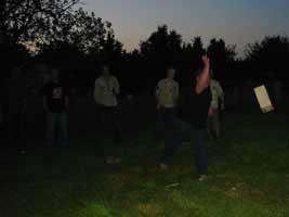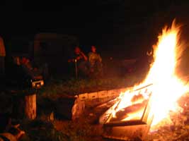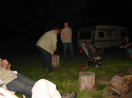 Bevor wir dann ans Feuer gingen, kam noch das Stoßen zum Abschluß; einer Idee von Christian nach. | Dann wurde kräftig eingeheizt. Der Schuppen war voller Brennholz und es warteten auch Fenster darauf, verbrannt zu werden. | Mit allen wurde ein kräftiges Gelage am Lagerfeuer abgehalten. Viel Spaß entwickelte sich bei Wetten, welches Fenster wie lange hielt... |
