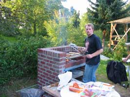 ...konnte das Bier in der Waschstelle in vollem kalten Wasser gekühlt werden und Daniel machte sich daran, den Grill das erste Mal einzuweihen. | Dann aßen wir gemeinsam. Nach Urteil der Fleischesser leistete der Grill 1a-Dienste. | Für September hatten wir wirklich einmaliges Wetterglück nach Wochen des Regens. Es wurde dann schon einmal Feuer gemacht. |