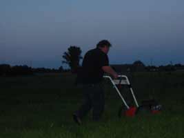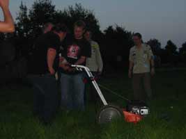 Doch zuerst wurde mit unserem Hightech-Mäher, den einige gerne mal ausprobierten... | ...eine Wurfschneise in die Nachbarwiese gemäht, da die richtige Wiese inzwischen top gepflegt ist. | Andreas beim Schleudern. Patric, das muß man neidlos eingestehen, hatte übrigens fast immer die Nase vorn. |