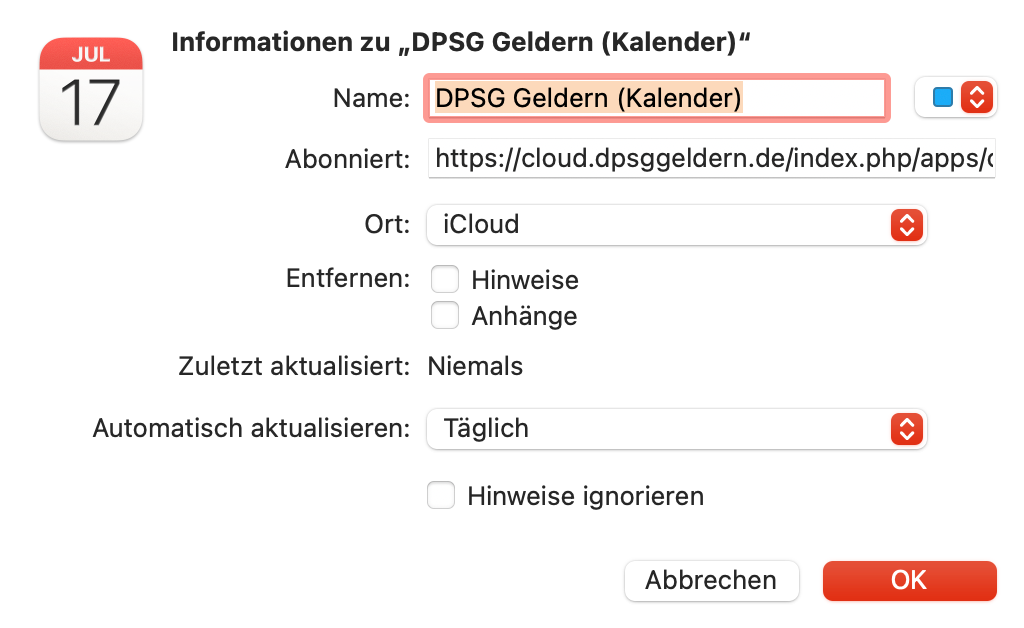 Um den Link zu kopieren statt aufzurufen, benutze beim Desktop die übliche Kopiermethode, beim Smartphone länger gedrückt halten, dann Link kopieren auswählen und dann in der Kalender-App als neues Abonnement hinzufügen – die Aktualisierung sollte auf täglich stehen …