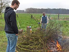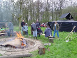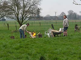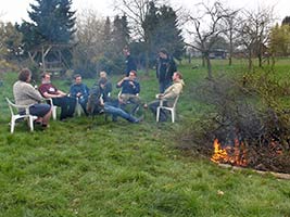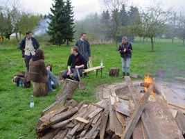 Zwischendurch durfte selbstverständlich mal Pause gemacht und sich schon auf den | gemütlichen Teil am Abend vorbereitet werden. Das Feuer wollte angesichts der | vielen dünnen Äste erst nicht hochkommen, schaffte es dann jedoch doch... |