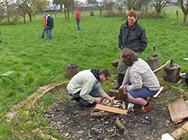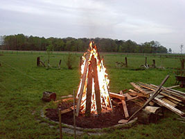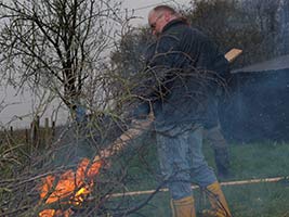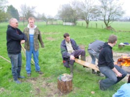 So ziemlich am Anfang, in noch sehr kleiner Runde, wurde das Feuer in Gang gesetzt... | ...welches wieder einmal viel zu futtern bekam. Die Gruppe von Herbert, die auch | kurz vertreten war, schaute sich an, wie der Donnerbalken und der Sichtschutz... |