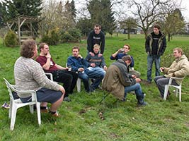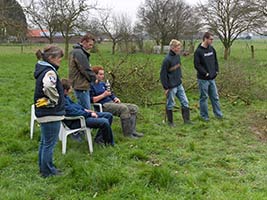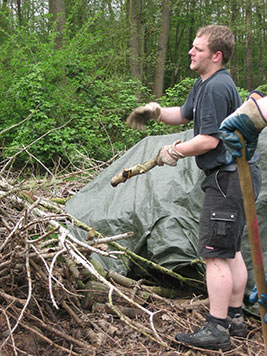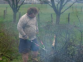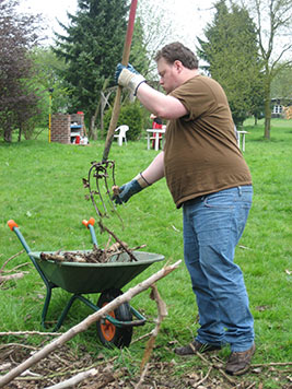 An unserem Wiesenwochenende 2008 sollte also geschafft werden: Holz zerkleinern, hacken, aufschichten, Stapel von Ästen unter die Bäume aufschichten als Nistplatz für Vögel und Unterschlup für andere Tiere, Schuppen aufräumen, evtl. Löcher auf der Wiese stopfen, die alte Sitzbank neu herrichten, Abfallholz verbrennen (Platz schaffen), zwei alte Schränke von Familie Sämisch verbrennen, Vorplatz aufräumen (wenn die Äste weg sind) und harken, damit der Rasen sich an der Stelle erholen kann. Und nicht zuletzt: Natürlich Spaß haben. Nicht wenig für gut zwei Tage... Und umso erstaunlicher, daß wir sogar teilweise mehr geschafft haben (nämlich den Rasen zu mähen), angesichts der traurigen Tatsache, daß der offiziellen Leiterrundenveranstaltung Wiesenwochenende so wenige gefolgt sind...