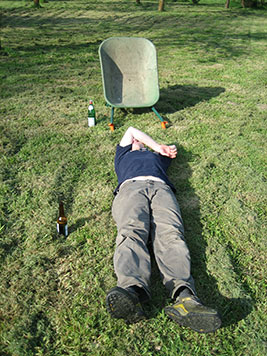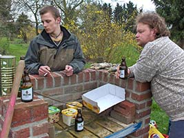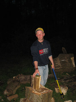 Die Pause ist verdient. | Andreas, der Samstag den ganzen Tag arbeiten mußte, kam abends wieder vorbei und powerte dann noch ein wenig und hackte noch viel Holz klein. | Der Rest wurde ordentlich eingeheizt. |