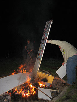 Alte Zeitgeschichte wird dem Feuer geopfert. Wie viele Aufkleber wohl vernichtet worden sind? | Am Samstag ging es richtig los. Der riesige Holzstapel, fast ein Jahr getrocknet, wurde zwischen die Bäume geschichtet… | …der Platz nach und nach aufgeräumt. Alles, was nicht verwertet werden konnte, wurde verfeuert. |