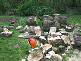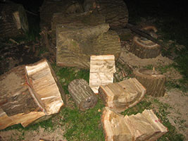 Siehe oben: In der Zwischenzeit ist wieder eine ganze Menge auf der Wiese passiert, sowohl von den Aktionen her, als auch von der Pflege nebenher, die vornehmlich weiterhin von Andreas und Gregor, dem Wiesenausschuß, geleistet wird. In der letzten Zeit und im Spätsommer 2007 konnten diese auf Hilfe anderer Art setzen: Bei jeder Aktion wird natürlich ein Lagerfeuer gemacht. Also braucht man ständig Nachschub an Holz, ganz egal in welcher Form (wir brauchen ja kein kleines Kaminfeuer). Und so, wie wir in den Sommerferien 2007 mal eben mit einigen Leuten des Stammes auf Initiative von Gregor einen alten Taubenschlag (siehe Osterfeuer 2008) zur Wiese gekarrt haben, so haben wir später noch mehr Holz bekommen. Und das war so viel und so gewaltig, daß es fast ein halbes Jahr vor unserem Schuppen lag, da es keiner weggeschafft bekam.