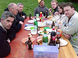 Ganz zu anfang wurde bereits das Feuer entfacht, es mußte Platz geschaffen werden. | Herbert besuchte uns auch kurz auf dem Wochenende. | Gemeinsames Essen. Jeder hatte spontan noch etwas mitgebracht, so daß genügend Auswahl vorhanden war. |